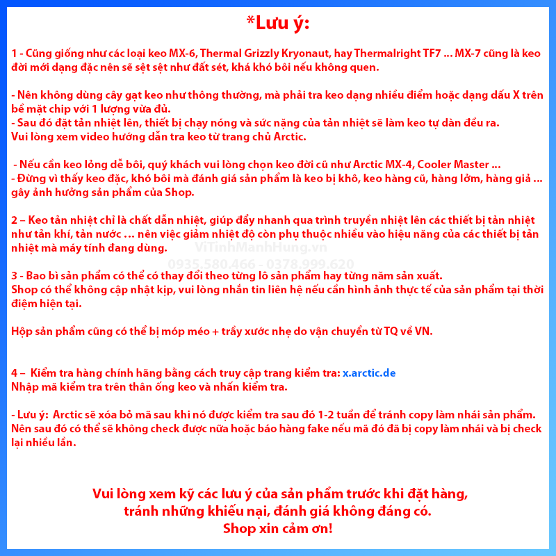 - Hàng chính hãng, có thể kiểm tra bằng mã code dán trên ống keo trên trang kiểm tra của Arctic.